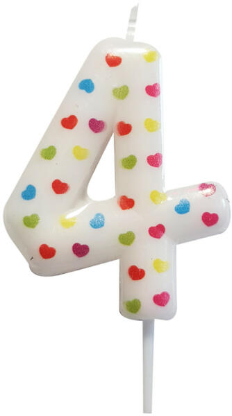 Fehér színű, szívecske mintás számgyertya , mellyel egyszerűen díszítheted az otthon készített vagy boltban vett születésnapi tortát. Tulajdonságok: Anyaga: viasz A gyertya mérete: - Magassága: 90 mm - Szélessége: 45 mm