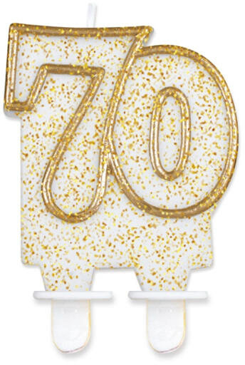 Torta gyertya. 70-es szám. Fehér, arany szegéllyel. Magassága: 8cm.
