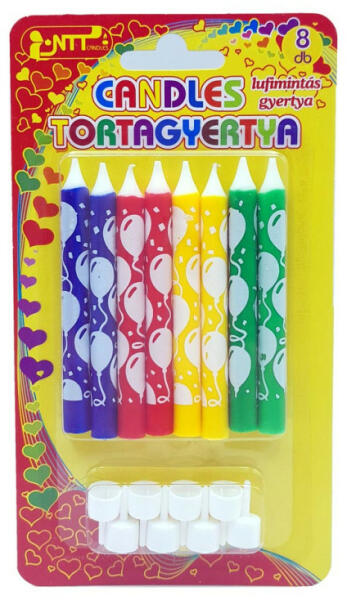 Tortagyertya 8db - Fehér lufimintás Ezek a vidám gyertyák elengedhetetlen kellékei a születésnapi tortáknak 8 db gyertya 8 db tartóval Égő gyertyát ne hagyjon őrizet nélkül!