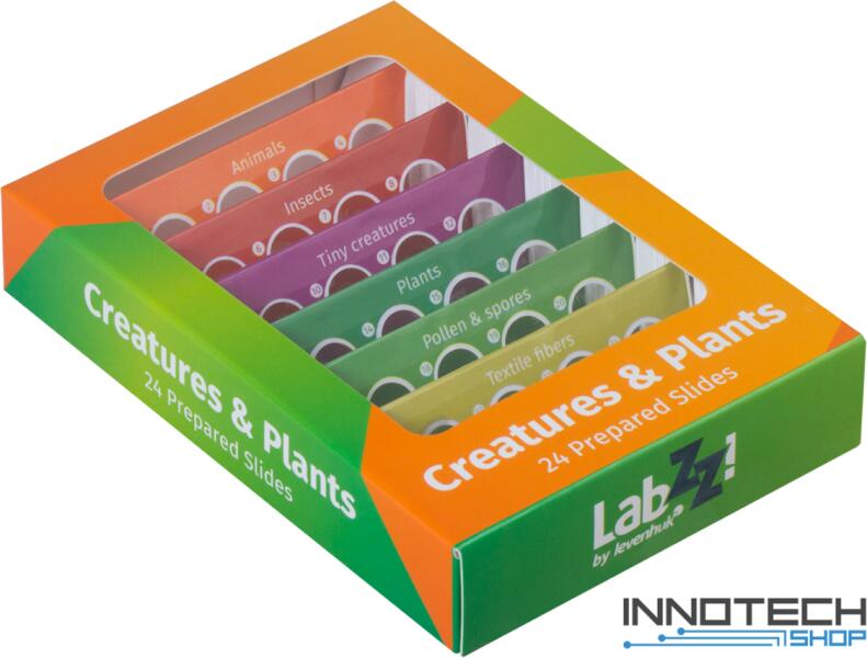 A Levenhuk LabZZ előkészített tárgylemez-készlet eredeti kialakítású tárgylemezekben különböző mintákat tartalmaz. Javasolt életkor: 8 - 99 éves korig Kiknek ajánlott: Lányoknak és fiúknak Levenhuk LabZZ CP24 Élőlények és növények – előkészített tárgylemez-készlet Alkalmazási terület: növény- és állattanA Levenhuk LabZZ előkészített tárgylemez-készlet er