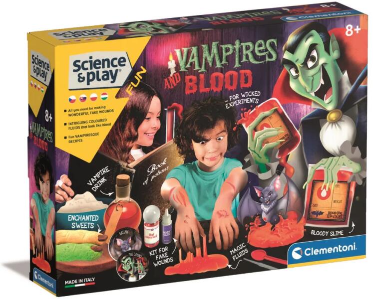 A Clementoni - Tudomány és játék - Vámpír és vér slime készlettel hátborzongató, színes nyálkákat készíthetsz szórakoztató és emellett tudományos módszerek segítségével! A készletben mindent megtalálsz, hogy műsebeket és művért készíts. Merülj el a vámpírok világában, miközben szórakoztató módon ismerkedhetsz meg a kémiai alapelvekkel! A kézikönyv segít