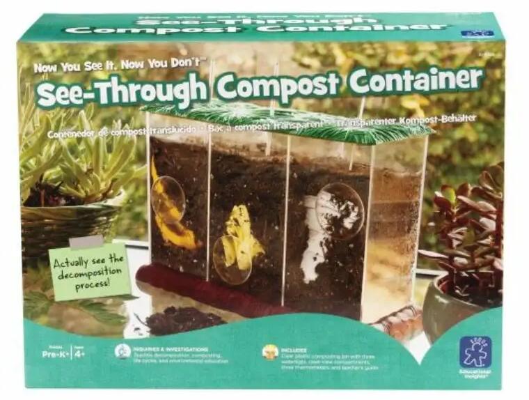 A 3 különálló, szellőztetett rekesz lehetővé teszi a gyerekek számára, hogy világosan megnézhessék a teljes lebomlási folyamatot, és összehasonlítsák egymást a különböző anyagok között. A mellékelt hőmérők demonstrálják a hőmérsékleti változásokat a bomlás során. Tartalma: átlátszó doboz műanyag műfüves tetővel, 3 rekesszel, szellőzőnyílásokkal nagy