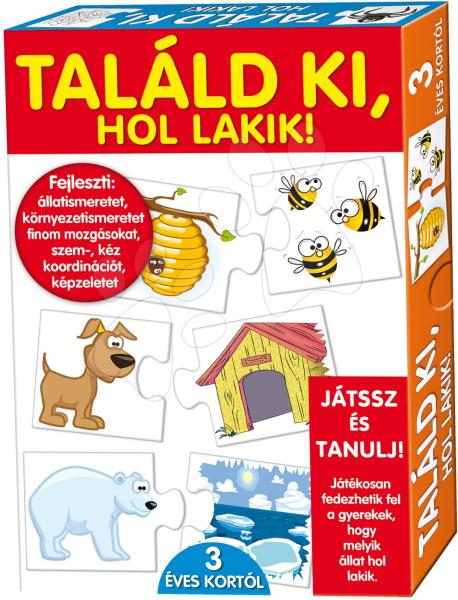 Játék Találd ki hol lakik? az európai Dohány gyártótól egy fantasztikus oktatójáték minden kíváncsi kisgyereknek. Alkalmas kisfiúknak és kislányoknak egyaránt 3 éves kortól . Ennek a gyermek oktatójátéknak a lényege összepárosítani az állatokat házikójukkal . Az egyes részek puzzle alakban vannak, így a megfelelő részek egyszerűen összeilleszthetők. Ez a gyerekj
