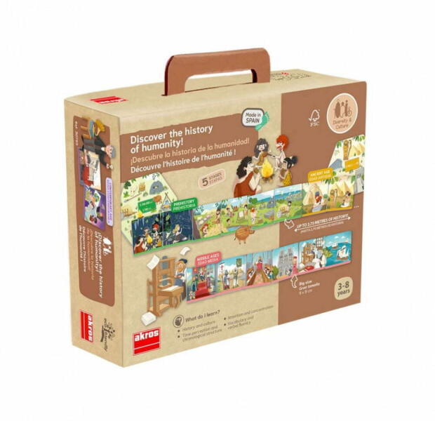 Fedezzük fel együtt és helyezzük időrendi sorrendbe ezzel a szórakoztató játékkal a történelem különböző szakaszait, fő eseményeit, az emberiség nagy lépéseit, a kezdetektől napjainkig. A játék segít a figyelem, a koncentrációs képesség, valamint a szókincs fejlesztésében. Játék közben könnyedén és egyszerűen tanulhatunk, bővíthetjük történelmi ismeretein