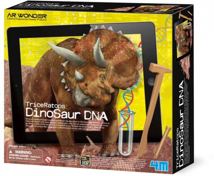 A 4M Triceratops DNS készlet felhőtlen szórakozást nyújt a gyerekeknek. A 4M Triceratops DNS készlettel egy foszforeszkáló Triceratops csontvázat lehet elemezni. A Triceratops DNS-ét be lehet gyűjteni, és 4M mobilos alkalmazással lefényképezni, amivel ezt a hatalmas dinoszauruszt életnagyságban meg lehet jeleníteni a saját szobádban! A 4M Triceratops DNS készlet jellemzői: -