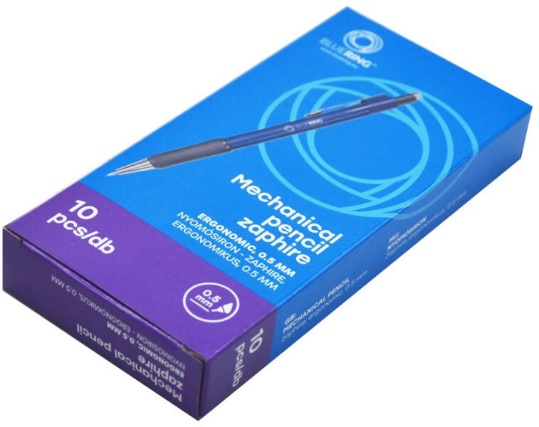 NYOMÓSIRON 0,7MM BLUERING 0,7mm vonalvastagságú mechanikus ceruza, extra hosszú radírral a végén, ami a nyomógomb elforgatásával adagolható. Visszahúzható fém hegy, fém klipsz.