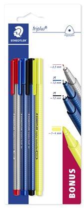 Vegyes Triplus készlet, amely tartalmaz 1 db tűfilcet (0,3mm) piros színben, 2 db golyóstollat (M) kék és fekete színben, és 1 db sárga szövegkiemelőt (1-4mm). -ergonomikus, háromszögletű íróeszközök a kényelmes használatért -a készlettel mindig kéznél van a megfelelő íróeszköz -különböző felhasználási területekhez, pl. irodában, egyetemen, szabadidőben Gyárt