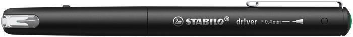 STABILO dr!ver prémium tűfilc elsősorban irodai használatra. -elegáns, klasszikus dizájn -részben átlátszó kupak -csúszásmentes, puha gumi markolat -rugós hegy a kényelmes és kellemes írásélményért -tolltest anyaga: előállításához 93%-ban bioalapú műanyag került beszerzésre (mass balance - módszer) -elkenődésmentes -szagtalan vízbázisú tinta -vonalvastagság: 0,4