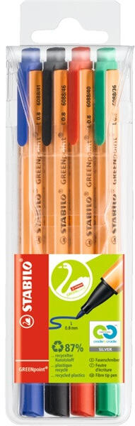 Stabilo Greenpoint 4db-os vegyes színű filctoll készlet - STABILO GREENpoint rostiron készlet 4 db-os - 98%-ban újrahaszínosított műanyagból készülő, környezetbarát rostirón - Praktikus tollméret és csíptető a mobilitás fokozására - Erős, 0,8 mm vastag hegy