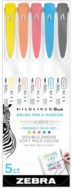 Zebra Mildliner Brush Friendly 5db-os kettős végű ecset marker A Mildliner Brush&Marker kettős végű marker, ecset végű és extra vékony kerek heggyel (0,5-4,0 mm). Tintája vízálló, nem fakul, arhiválásra alkalmas. Kreatív tevékenységhez, naplózáshoz, rétegezéshez ajánljuk. A Friendly szettben 5 kedvelt szín található: sötétszürke, ciánkék, korallrózsaszín, bara