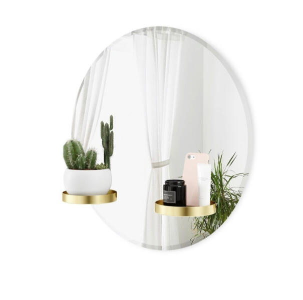 Elegáns fali tükör két kerek réz polccal, amely tökéletes kombinációja a funkcionalitásnak és a modern dizájnnak. A ferde szélű tükör és a polcok hat különböző módon konfigurálhatók, így személyre szabható megoldást kínál. Innovatív tárolási megoldás stílusos kivitelbenAz Umbra Perch fali tükör egy különleges darab, amely ötvözi a praktikumot és az esztét
