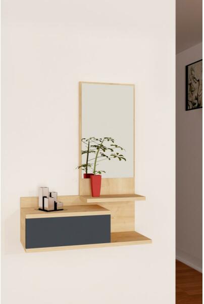 Fali tükör polccal és fiókkal a házból való távozáskor kéznél lévő dolgok tárolására. Egyszerű, modern stílusának köszönhetően bármilyen otthonba illik. Bézs és antracit színben kivitelezve. Laminált forgácslapból készült. Anyagvastagság: 1,8 cm. Tükör méretei: 65 x 29,5 cm. A fiók méretei: 30,5 x 31,3 cm. Fa mintázata: tölgy.