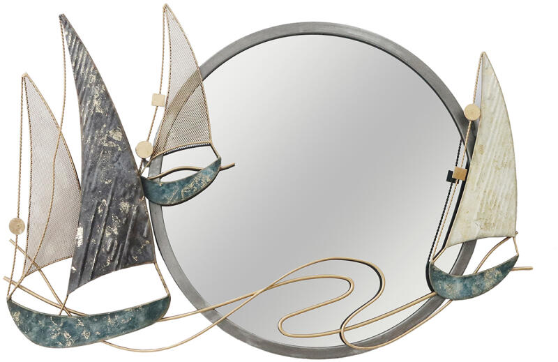 Fém vitorlásokkal díszített tükör MÉRETE: 78 × 4,5 × 56 magas cm ANYAGA: fém, üveg CSOMAGOLÁS: kartondoboz Fedezze fel a tengeri elegancia és a vintage stílus tökéletes ötvözetét amely a fém vitorlásokkal díszített tükör. Ez nem csak egy praktikus tükör, hanem egyedülálló díszítőelem is otthonában, irodájában vagy akár vitorlásán. A 78 × 4,5 × 56 cm méret