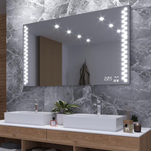 Luxus dizájner LED-es tükör , amely nem csak szépségének és praktikumának köszönhetően varázsolja új térré a fürdőszobáját, hanem különösen a több mint 7 lehetséges kiegészítőnek köszönhetően. : Opcionális LED-es tükörvilágításs Érintésve zérlés Bluetooth hangszóró Tükör fűtés Meteorológiai állomás WIFI-vel Kozmetikai nagyító tükör Üveg polc