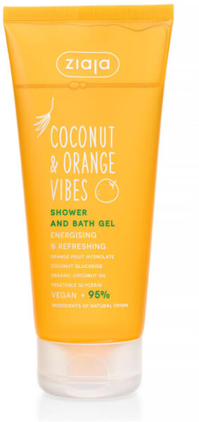Ziaja coconut and orange vibes tusfürdő gél 200 ml Frissítő tusfürdő a bergamot és kókuszdió nektár finom illatával és a narancs erejével. Tisztít és tonizál. Használat közben energizáló, friss érzést biztosít és segít a stresszoldásban. Minden bőrtípusra alkalmazható. Fő összetevők: narancsvirág hidrolátum, kókusz glükozid, bio kókuszolaj, növényi glicerin