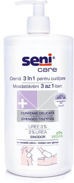 A Seni Care mosdatókrém szappanos-vizes mosdatás helyett használható. Hármas hatással bír: finoman tisztít, táplál és bőrvédelmet is nyújt. Frissítő érzést kölcsönöz a bőrnek anélkül, hogy befolyásolná annak természetes hidrolipid védőrétegét, hatékonyan csökkenti a feszítő érzést a bőrön. Praktikus pumpás adagolóval, mindennapos használatra. Összetevők