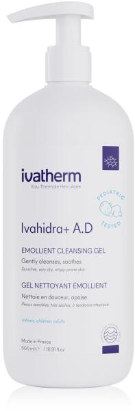Ivahidra+ AD bőrpuhító tisztító gél, Ivatherm, arc és test, érzékeny, száraz, nagyon száraz vagy atópiás bőrre, alkalmas gyermekeknek és csecsemőknek, 500 ml Az Ivahidra+ AD lágyító gél biztosítja a száraz, nagyon száraz és atópiás bőr tisztítását és hidratálását, csillapítja a viszketést és az irritációt. A minimális összetevőket tartalmazó, magas tolera