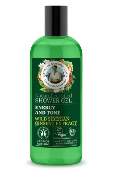 Babushka Agafia hidratáló és frissítő tusfürdő gél 5 mezei gyógynövénnyel, 260 ml - Energetizáló és tonizáló tusfürdő gél vad szibériai ginzeng kivonattal - Energiával tölti fel, tonizálja a bőrt és rugalmasságot biztosít neki - Magas A, C, D, E, B vitamin tartalmának köszönhetően tonizál és egész napra energiával tölti fel a bőrt- BDIH minősített, vegán nat