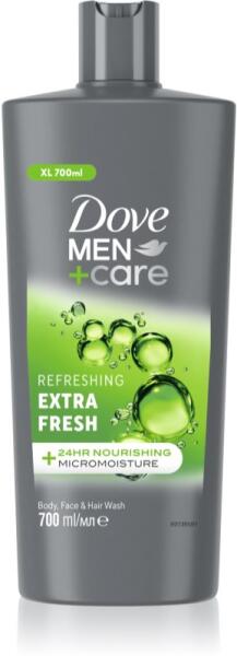 Dove Men+Care Extra Fresh, 700 ml, Tusfürdők és szappanok férfiaknak, A kényeztető Dove Men+Care tusfürdő gél elengedhetetlenül hozzátartozik a mindennapi higiéniához. Gyengéden, mégis kímélően tisztítja és hidratálja a bőrt a teljes testfelületen. Tulajdonságok: lemossa a bőrt és eltávolítja a szennyeződéseket használata után frissesség és energia érzetet ad lá