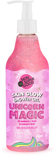 Skin Super Good ragyogásfokozó tusfürdő gél Unicorn Magic, 500 ml - Természetes összetevői intenzíven ápolják a bőrt- Mélyen hidratálja és ragyogóan selymessé varászolja a bőrt- Az eper javítja a bőr általános textúráját - Az acai természetes és fiatalos ragyogást biztosít- Az összetevők 98,5%-a természetes - Gluténmentes, vegán termék Összetevők: - Aqua, Sodi