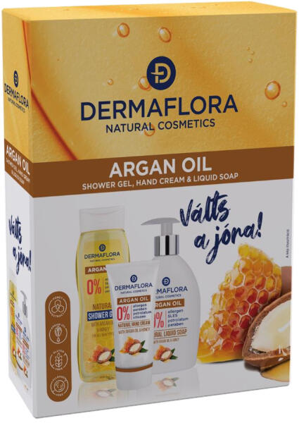 Dermaflora 0% díszdoboz (folyékony szappan+kézkrém+tusfürdő) argán 1 db FOLYÉKONYSZAPPAN A Dermaflora Natural Cosmetics 0% Argan oil&honey folyékony szappan a tisztítás mellett hidratálja is a bőrt kézmosás közben. Tökéletes választás érzékeny bőrű, száraz kezeknek. Használatával a kéz puha tapintásúvá válik. KÉZKRÉM Az argánolaj magas E-vitamin tartalma hat