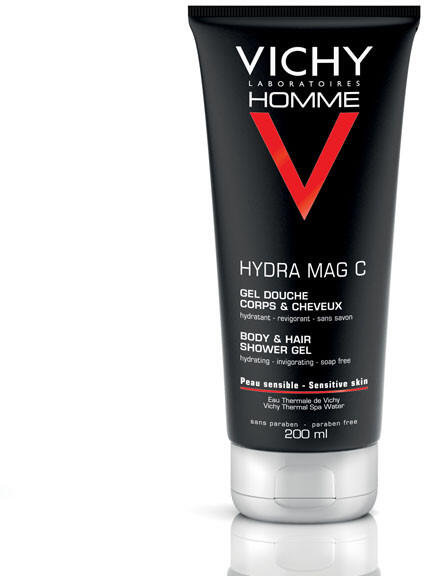 A Vichy Homme Hydra Mag C hidratáló tusfürdõ és sampon energizáló tusfürdő és sampon férfiaknak. Olyan érzékeny bőrű férfiak számára, akik fel szeretnék pezsdíteni testüket és hajukat indulás előtt. Érzékeny bőrre. A magnézium és a C-vitamin formulája mindennap energiával tölti fel bőrét. Teste felfrissül, bőre hidratált lesz, hosszantartó komfortérzetet bizt