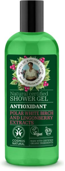 Babushka Agafia bio tusfürdő gél antioxidáns sarki fehérnyír- és vörösáfonya-kivonattal 260 ml Tusfürdő gél a tajga aromáival. A bio sarki fehérnyír-kivonat puhává, simává és hidratálttá teszi a bőrt. Antioxidáns hatású. Vörösáfonya-kivonat antioxidánsokban gazdag, biztosítja a bőr rugalmasságát. A s zibériai tajga egy szinte felderítetlen világ, melyet érint