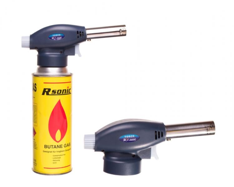 Kiváló minőségű gázégő, szabályozható lánggal, elektromos gyújtással. Mérete: 170 x 66 x 55 mm. Súlya: 153 gramm. Anyaga: fém, műanyag. Előnye: újratölthető.