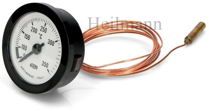 -Fekete tok -Műanyag keret átmérő: Ø52mm -Rézkapillár: 1500mm -Tartomány: +50+350°C -Szonda: Ø6mm, 25mm -Maximum hőmérséklet: +70°C (műanyag)