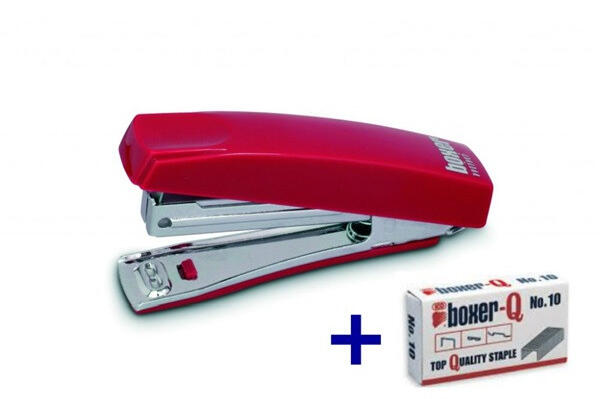 Boxer No. 10 mini fűzőgép + kapocs - Kisméretű, fémszerkezetű fűzőgép, fűző funkcióval, műanyag takaróelemekkel, ergonomikus nyomófelülettel - Használható kapocsméret: No. 10 - Fűzési mélység: max. 50 mm - Egyszerre összefűzhető lapok száma: max. 10 lap - Szín: vegyes színekben (színválasztás nem lehetséges) - 1 doboz (1000 db) ajándék no. 10 kapoccsal