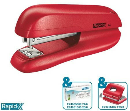 Tűzőgép, 24/6, 26/6, 20 lap, RAPID "F6", piros - könnyen használható, erős, féltáras tűzőgép fém szerkezettel - kapacitás: 20 lap - tűzési mélység: 50 mm - javasolt kapocs: Rapid 24/6 és 26/6 Rapid tűzőkapcsokhoz (E24855600 / E24861300) - alkalmas zárt, nyitott és U-alakú tűzésre - kényelmes utántöltés a felültöltős szerkezettel - 5 év garancia Rapid tűzőkapcsok