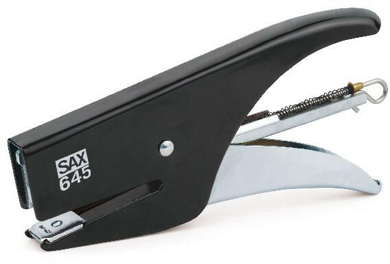 Tűzőgép SAX 645 20 lap 6/4 fekete Fémtestű fűzőgép, hátul tölthető, tűző-fűző funkcióval, fekete, piros és kék színben. Egyszerre összefűzhető lapok száma: 20 lap. Fűzési mélység: 45 mm. Használható kapocsméret: 6/4.