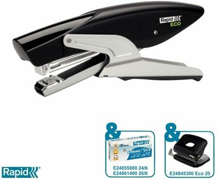 - 81%-ban újrahasznosított kommunális műanyag hulladékból - kőolajmentes, szója alapú festékkel nyomott , vízbázisú ragasztóval ragasztott újrahasznosított karton csomagolás - újrahasznosítható, szétszedhető részekből áll - kapacitás: 20 lap - tűzési mélység: 55 mm - javasolt kapocs: Rapid 24/6 és 26/6 Strong tűzőkapcsokhoz (E24855800 / E24861400) - alkalmas zárt