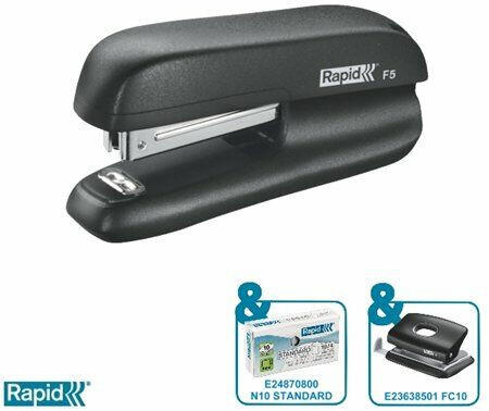 Tűzőgép, mini, No. 10, 10 lap, RAPID F5, fekete (E5000264) - kompakt méretű, könnyen használható, kisméretű, hordozható tűzőgép acél tárral a hatékony tűzés érdekében - ideális otthoni és iskolai használatra - kapacitás: 10 lap - tűzési mélység: 38 mm - javasolt kapocs: Rapid 10/4 (N10) STANDARD horganyzott (E24862900) - alkalmas zárt és U-alakú tűzésre - kényelm