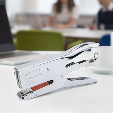 Rapesco Porpoise ONE tűzőgép, ideális gyors tűzéshez és csomagoláshoz -felhasználási területek: posta, vendéglátó helyek, raktárak és egyéb területen -kézi tűzőgép -tartós fém test, fém szerkezet -hátultöltős, újratölteni a hátsó rugó benyomásával, illetve kiakasztásával lehet -lapkapacitás: 2-45 lap (80g/ms) -tűzőkapocs: 24/8 mm -ajándék tűzőkapocs: ige