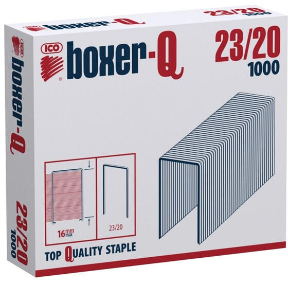 Boxer-Q 23/20 fűzőkapocs - Horganyzott 23/20-as fűzőkapocs - Hegyezett, extra erős, galvanikusan horganyzott anyagból - Mérete: 11,5 x 20 mm - Kiszerelés: 1000 db/doboz