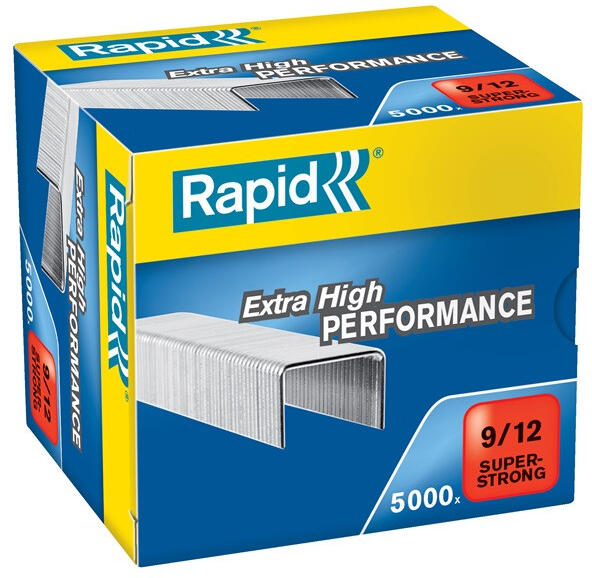 Rapid Superstrong 5000db/doboz 9/12 horganyzott tűzőkapocs Egyedülálló, nagyteljesítményű tűzőkapocs Rapid HD9 tűzőgéphez a tökéletes eredmény érdekében. Kiváló minőség és teljesítmény. 60-90 lap tűzéséhez (80 g-os papír). 5000 db / doboz SUPERSTRONG (extra erős) tűzőkapocs, melyet a csomagoláson piros szín jelöl 12 mm-es szárhosszúság Galvanizált, szupererő