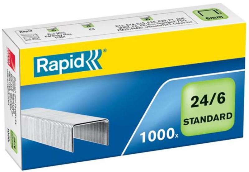 Tűzőkapocs, 24/6, horganyzott, RAPID Standard (E24855600) - finomhuzal tűzőkapocs (20 lapig) - 2-20 lap tűzéséhez (80 g-os papír) - STANDARD erősség, melyet a csomagoláson zöld szín jelöl - 6 mm szárhossz - galvanizált finomhuzal a könnyű és kényelmes használatért - éles szárak a pontos tűzés érdekében Gyártó/első EU forgalmazó elérhetősége: Esselte Kft. 1139 Bud