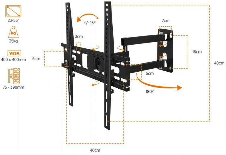 A FALTÓL VALÓ TÁVOLSÁG BEÁLLÍTÁSA - a TV-akasztó lapos kialakítása lehetővé teszi, hogy a TV-t minimális távolságra helyezze el a faltól. A hosszú kar lehetővé teszi, hogy a faltól való távolságot 40-385 mm tartományban állítsa be, az Ön preferenciáinak és helykínálatának megfelelően. FÜGGŐLEGES BEÁLLÍTÁS - a fogantyú lehetővé teszi a képernyő szögének
