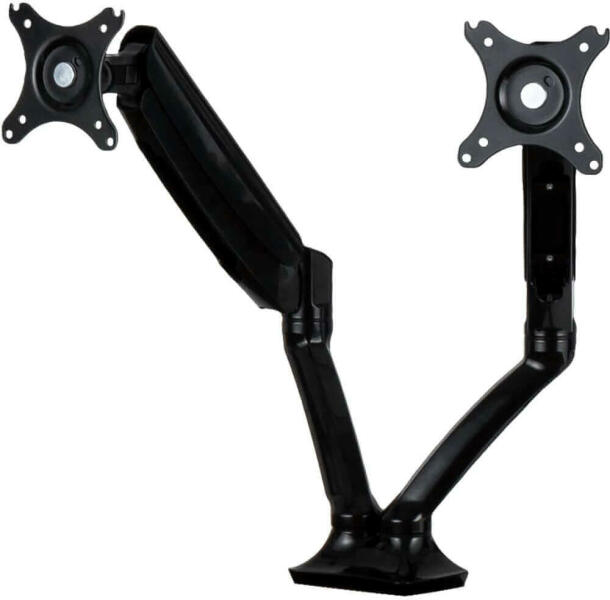 Két monitortartó A monitortartó egy praktikus segédeszköz , amely több helyet biztosít az asztalon. VESA rögzítéssel állítható és forgatható. Egy kar terhelhetősége 9 kg-ig . 10"-27" méretű monitorhoz. Jellemzők és funkciók Állítható magasság az Ön igényei szerint. A monitortartó helyes használata segít megelőzni az olyan problémákat , mint a hátfájás és a nya