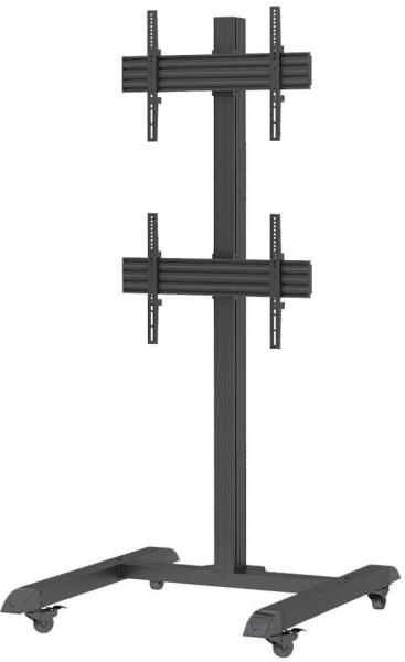 Univerzális prezentációs állvány HS-1B2Professzionálisan kialakított, állítható magasságú TV-állvány bemutatókhoz, kiállításokhoz, vásárokra, iskolákba, közterekre és otthonokba egyaránt. Ajánlott 32" - 65" (81 - 165 cm) TV-hez, teherbírása 100 kg. VESA szabvány (szerelőfuratok távolsága) 100x100 és 600x400 mm között. Könnyű kezelhetőségA két tévé számára