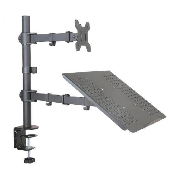 SPECIFICATION Recommended screen size: 13- 32/ 33 - 81 cm Number of screens: 1 Maximum load (kg): 12 / 8 monitor + 4 notebook VESA: 75x75 - 100x100 Vertical tilt: +45°/ -45° Swivel: +90°/ -90° Screen rotation: +180°/ -180° Clamp coverage (mm): 10 - 88 Arm range (mm): 399 Pole diameter (mm): 35 Pole height(mm): 443 Shelf dimensions (mm): 300x280 Material: Steel/Aluminium Color: Black Surface
