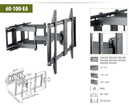 60-100", max 80Kg, Dönthető: -15° - +5°, Forgatható: -45° - +45° VESA: 200x200, 300x300, 400x200, 400x400, 600x400 VESA: 800x400, 800x600, 900x600 Specifikációk:Alkalm azhatóság: TV/Monitor Kivitel: Fali Teherbírás: 80 Dönthető: Van Forgatható: Van Állítható: Van Szín: Fekete Min. kijelző méret: 60 Max. kijelző méret: 100 Max. VESA méret: 900x600 Min. VESA méret: 200x200