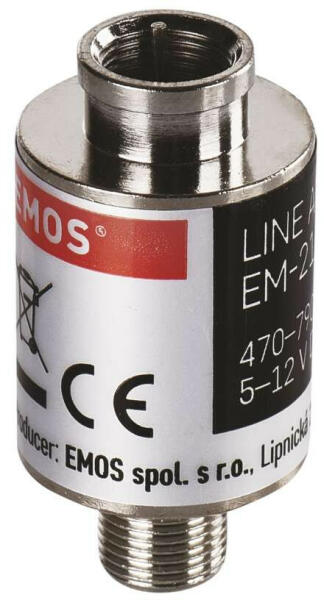 EMOS vonalerősítők, előerősítők, LTE szűrő jellemzői: jelerősíté s: 20–30 dB, F csatlakozók (be/ki), IP45 beépített LTE-szűrő, 790 MHz elnyomja a mobil interferenciát LTE-szűrő külön is megvásárolható (régi antennákhoz) Tulajdonságok: Értékesítési csomagolás: 1 db, header card Méretek: 20 × 42 mm Táplálás: 5–12 V DC, 65 mA Termék: árnyékolt vonalerős