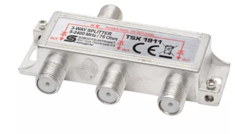 Somogyi Elektronic 3-utas F elosztó (TSX 1911) 75 Ohm impedancia szélessávú jelátvitel: 5-2400 MHz feszültségbemeneti lehetőség a kimeneteken keresztül távtáplálási opció: 15 V / 1A max. stabil cink-ötvözet konstrukció víznek ellenálló: IP44 felcsavarozható; tartozék csavarokkal 3 utas 1 x bemenet – 3 x kimenet Műszaki adatok: csatlakozók : "F" bemenet / 3 x "F" kimenet