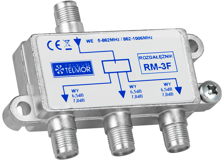 ROZGAŁĘŹNIK ANTENOWY TELMOR RM-3F Prosty montaż i pewne podłączenie Bardzo dobra separacja wyjść Wysoka skuteczność ekranowania Solidna, odlewana, metalowa obudowa Rozgałęźnik małostratny marki Telmor przeznaczony do rozgałęziania lub sumowania sygnałów radiowych i telewizyjnych we wszelkiego rodzaju instalacjach antenowych. Umożliwia przejście sygnałów z jednego przewodu kon