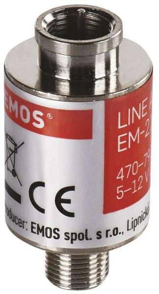 EMOS vonalerősítők, előerősítők, LTE szűrő jellemzői: jelerősíté s: 20–30 dB, F csatlakozók (be/ki), IP45 beépített LTE-szűrő, 790 MHz elnyomja a mobil interferenciát LTE-szűrő külön is megvásárolható (régi antennákhoz) Tulajdonságok: Értékesítési csomagolás: 1 db, header card Méretek: 20 × 42 mm Táplálás: 5–12 V DC, 65 mA Termék: árnyékolt vonalerős