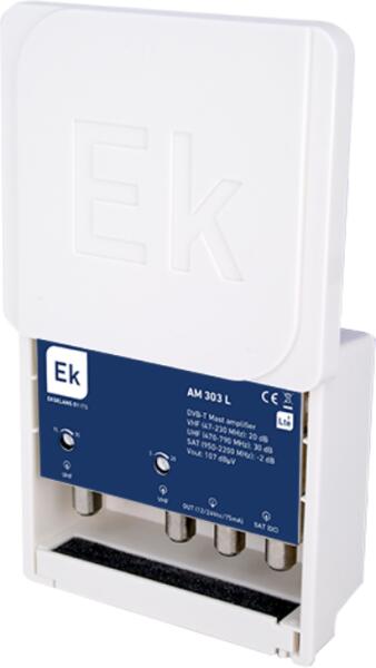Árbóc előerősítő 3 bemenettel - Ekselans AM 303 L2 051029Árbocra szerelhető előerősítő 3 bemenettel: - VHF (47-230 MHz) - UHF (470-694 MHz) - SAT (950-2200 MHz) - erősítés : 20dB (VHF) / 30dB (UHF) / -2dB (SAT) - Maximum kimeneti jelszint (DIN 45004B): 107dBuV - tápfeszültség tartomány: 12-24V - SAT bemeneten keresztül táv-táplálható az LNB - könnyen szerelhető kihajthat
