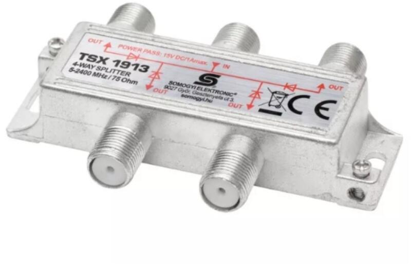 Somogyi Elektronic 4-utas F elosztó (TSX 1913) 75 Ohm impedancia szélessávú jelátvitel: 5-2400 MHz feszültségbemeneti lehetőség a kimeneteken keresztül távtáplálási opció: 15 V / 1A max. stabil cink-ötvözet konstrukció víznek ellenálló: IP44 felcsavarozható; tartozék csavarokkal 4 utas 1 x bemenet – 4 x kimenet Műszaki adatok: csatlakozók : "F" bemenet / 4 x "F" kimenet