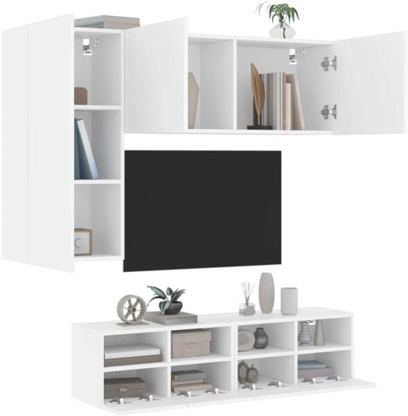 vidaXL 4 darab fehér szerelt fa fali TV-bútor Ezek a fali TV-egységek tökéletesek az otthonába a hely maximális kihasználására és a padló tisztán tartására. Masszív anyag: A szerelt fa kivételes minőségű, sima felületű, szilárd, stabil, és ellenáll a nedvességnek. Falra szerelhető kialakítás: A médiaegységek falra szerelhetők, így extra tárolóhelyet biztosítanak